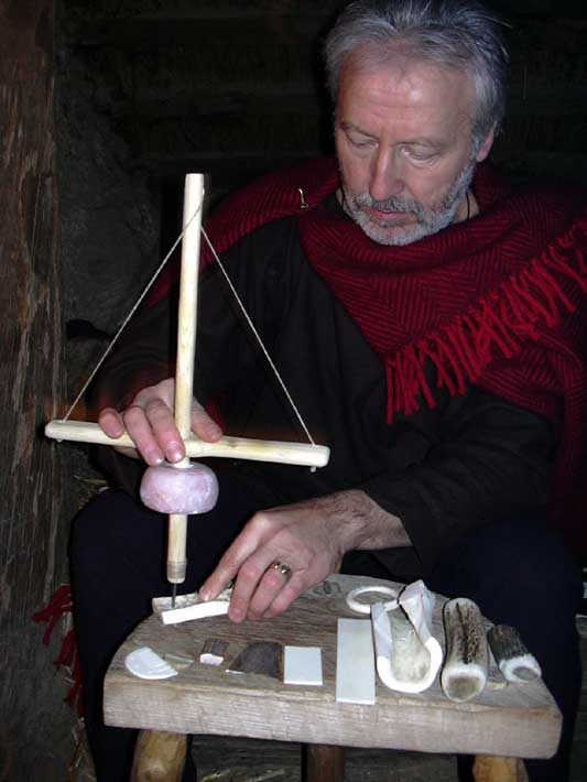 Knochenschnitzer mit Bohrer bei der Arbeit